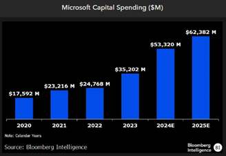 Companies are investing heavily to keep pace with the AI boom. Microsoft is projected to spend $62 Billion on capital expenditures in 2025, more than triple its 2020 outlay. These are tangible dollars from a mature business, signaling real economic activity. When paired with an accommodative Federal Reserve and expansive fiscal policy, this wave of tech-driven investment supports a constructive near-term economic outlook.