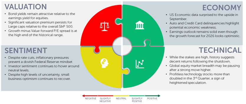 Economy: US Economic data surprised to the upside in September, but auto and credit card delinquencies highlight potential areas of economic weakness. The outlook for earnings remains solid even though growth forecasts for 2026 look overly optimistic.