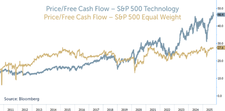 Free Cash Flow (FCF), defined as cash flow after capital expenditure, is especially relevant in this environment. From 2010 to 2020, tech stocks were reasonably valued relative to the broader market. But since ChatGPT’s release, tech valuations have surged while the rest of the market has remained near historical norms. One reason: FCF is falling as companies enter a capex arms race to meet AI demand.