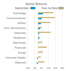 - Technology and communications services led the way in both September and YTD.