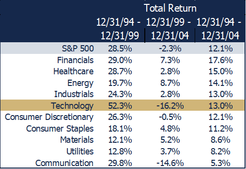 A historical review of technology sector performance around the dot-com era is instructive. The chart to the right breaks it into three phases: the five years post-Netscape, the subsequent five years, and the full decade. Tech stocks delivered over 50% annualized returns in the late ’90s, only to lose 16% annually from 2000 to 2004. Over the full ten-year cycle, technology landed squarely in the middle of sector performance[3]. Chasing momentum in the late ’90s didn’t pay off—and we believe the same caution applies today.