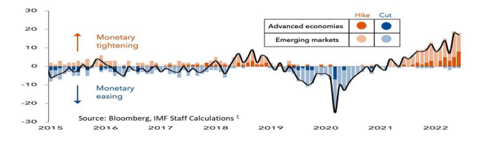 The market continues to digest the outlook for inflation and recession. As can be seen in the chart below, most central banks are in an inflation fighting mode, tightening policy. With the Fed committed to controlling inflation “no matter what the cost,” the potential for a soft landing in America—slowing growth without a full-blown recession—seems like a smaller bullseye this week than before.